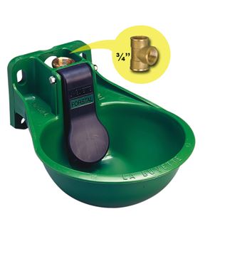 Abreuvoir synthétique à palette verticale et T de branchement Large bol synthétique résistant aux chocs. Idéal pour les chevaux ou les bovins. Le FORSTAL est équipé d'une robinetterie en laiton à l'efficacité et la fiabilité éprouvées depuis plus de 20 ans. Modèle avec palette verticale synthétique facilitant le nettoyage. Raccordement possible en circulation avec T 3/4” (20x27 mm) par le haut et le bas. 4 points de fixation, dont 2 oblongs pour faciliter le montage. Débit de 12 l./min à 3 bar.